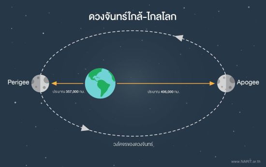 ดวงจันทร์โคจรรอบโลกเป็นวงรี 1 รอบ ใช้เวลาประมาณ 27.3 วัน ในแต่ละเดือนจะมีทั้งวันที่ ดวงจันทร์ใกล้โลกและไกลโลก ตำแหน่งที่ดวงจันทร์ใกล้โลกที่สุด เรียกว่า เปริจี (Perigee) มีระยะห่างเฉลี่ยประมาณ 357,000 กิโลเมตร และตำแหน่งที่ดวงจันทร์ไกลโลกที่สุด เรียกว่า อะโปจี (Apogee) มีระยะห่างเฉลี่ยประมาณ 406,000 กิโลเมตร การที่ผู้คนบนโลกมองเห็นดวงจันทร์เต็มดวงในคืนที่ดวงจันทร์โคจรเข้ามาใกล้หรือไกลโลกมีขนาดที่แตกต่างกัน นับเป็นเหตุการณ์ปกติที่สามารถอธิบายได้ตามหลักการทางวิทยาศาสตร์