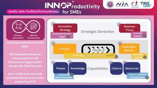 สำนักงานนวัตกรรมแห่งชาติ (NIA) ผนึกกำลังสถาบันเพิ่มผลผลิตแห่งชาติ (FTPI) และบริษัท ทริส คอร์ปอเรชั่น จำกัด เปิดตัว “โครงการ INNOProductivity for SMEs” เร่งสปีด SME ไทยให้เติบโตจากรายเล็กสู่รายกลาง ด้วยการผสานพลัง “นวัตกรรม + ผลิตภาพ” อย่างเป็นระบบ หวังปิดช่องว่างโครงสร้างเศรษฐกิจไทยที่ยังมี “โครงการ INNOProductivity for SMEs” น้อยเพียง 1.35% ของทั้งประเทศ