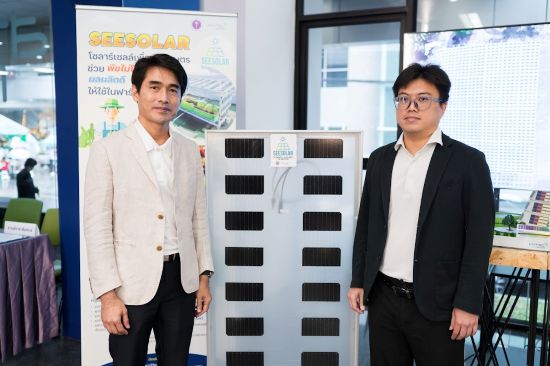ด้านเทคโนโลยีเซลล์แสงอาทิตย์: สนับสนุนการใช้พลังงานแสงอาทิตย์อย่างยั่งยืนและมีประสิทธิภาพสูงขึ้น ต้นทุนต่ำลง ด้วยนวัตกรรมที่น่าสนใจ อาทิ "Solar Sure" แพลตฟอร์มตรวจสอบแผงโซลาร์เซลล์หมดอายุ ส่งเสริมการนำกลับมาใช้ใหม่ (Second-life) ลดขยะอิเล็กทรอนิกส์ และจัดการซากอย่างถูกวิธี ซึ่งอยู่ระหว่างสำนักงานมาตรฐานผลิตภัณฑ์อุตสาหกรรม (สมอ.) พิจารณากำหนดมาตรฐาน และ "SEESOLAR" โซลาร์เซลล์เพื่อการเกษตร ที่ลดรังสี UV-B และความร้อน แต่ยังให้การแผ่รังสีแสงสังเคราะห์ หรือแสง PAR ผ่านได้ดี ช่วยให้พืชเจริญเติบโตได้ดีและอาจมีสารสำคัญสูงขึ้น อีกทั้งผลิตไฟฟ้าสำหรับควบคุมสภาพแวดล้อมในโรงเรือน และเพิ่มประสิทธิภาพ ลดต้นทุนพลังงานให้ภาคเกษตรกรรม