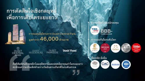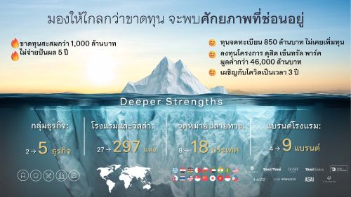 นอกจากนี้ หากมองรายได้ที่ขาดทุนจะพบศักยภาพที่ซ่อนอยู่ จากธุรกิจที่มีเพียง 2 ธุรกิจหลัก วันนี้ดุสิตธานีได้ขยายธุรกิจที่เกี่ยวข้องและพร้อมที่จะเติบโตอย่างแข็งแกร่งจาก 5 ธุรกิจ ได้แก่ โรงแรมและวิลล่าจาก 27 แห่ง เพิ่มเป็น 297 แห่ง โดยเป็นโรงแรม 57 แห่ง และวิลล่า 240 หลัง โดยมีเป้าหมายจาก 8 ประเทศทั่วโลก ขยายสู่ 18 ประเทศ และจากแบรนด์โรงแรม 4 แบรนด์ วันนี้ “ดุสิตธานี” มีแบรนด์ภายใต้การบริหารถึง 9 แบรนด์ ครอบคลุมทุกความต้องการของลูกค้า