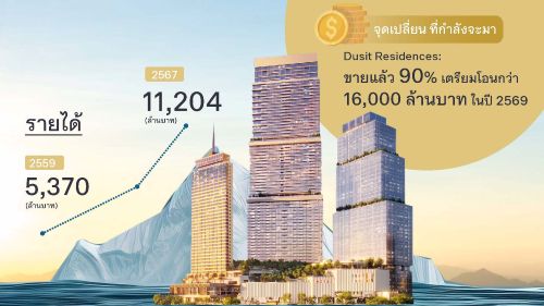 สำหรับภาพรวมบริษัทในช่วงที่ผ่านมา จากรายได้ 5,370 ล้านบาทในปี 2559 สู่รายได้มากกว่า 11,204 ล้านบาท ในปี 2567 แม้ว่าสิ่งที่ปรากฏในงบการเงินจะมีผลขาดทุนสะสมกว่า 1,000 ล้านบาท ซึ่งเป็นเหตุให้บริษัท งดจ่ายเงินปันผลตลอดระยะเวลา 5 ปีที่ผ่านมา แต่ในความเป็นจริงบริษัทกำลังสร้างรายได้ที่สูงสุดเป็นประวัติการณ์ และสูงกว่า 10 ปีที่ผ่านมากว่าเท่าตัว ซึ่งจุดเปลี่ยนสำคัญที่กำลังจะมาถึงคือการรับรู้รายได้จากการขายโครงการ “ดุสิต เรสซิเดนเซส” ที่ขายไปแล้วมากกว่า 90% มูลค่ากว่า 16,000 ล้านบาท หรือสามารถรับรู้รายได้มากกว่า 17,000 ล้านบาท ที่จะมีการทยอยโอนอย่างมีนัยสำคัญในปี 2569 รวมถึงโรงแรมอีกประมาณ 50 แห่งทั่วโลก ที่อยู่ในแผนการขยายธุรกิจของดุสิตธานี