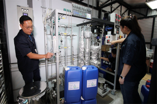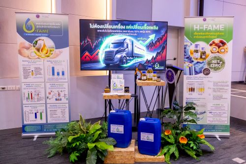 ด้วยคุณสมบัติของ H-FAME ไม่ได้อยู่แค่เรื่องคุณภาพน้ำมัน แต่ยังตอบโจทย์ใหญ่ของประเทศ ทั้งการลด คาร์บอนไดออกไซด์ได้ถึง 50% ลดฝุ่น PM ได้สูงสุด 86% และเสริมความมั่นคงทางพลังงาน เพราะสามารถผลิตได้เองจากวัตถุดิบในประเทศ ในด้านราคา เราผลิตได้ในระดับต้นแบบ 500 ลิตรต่อวัน และมีแผนขยายสู่ระดับโรงกลั่นสาธิต ในระดับ 10,000–30,000 ลิตรต่อวัน ซึ่งจะมีต้นทุนสูงกว่าน้ำมันดีเซลประมาณ 2 บาทต่อลิตร แต่มีแนวโน้มลดลงเมื่อขยายกำลังการผลิตในระดับอุตสาหกรรม ปัจจุบันอยู่ระหว่างหารือกับผู้ประกอบการไบโอดีเซลในประเทศ โดยคาดว่าจะเห็นความร่วมมือภายในปีนี้